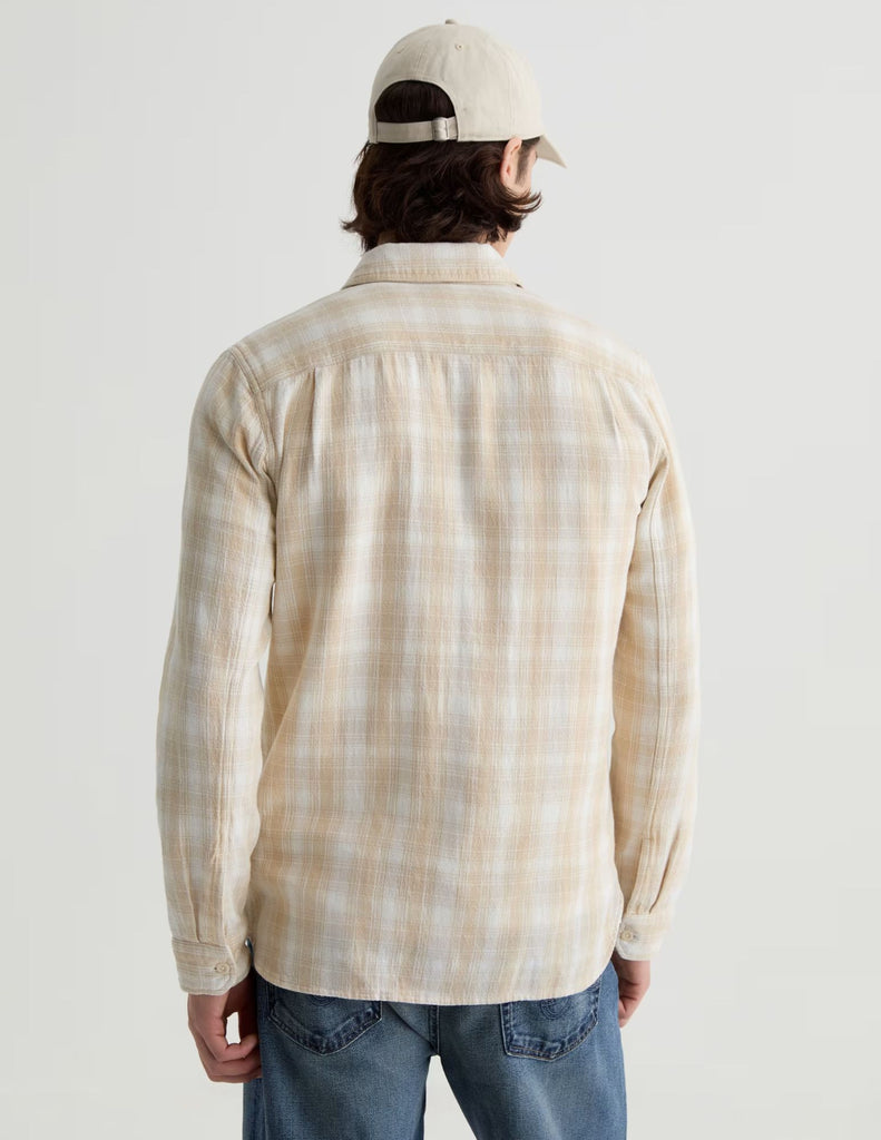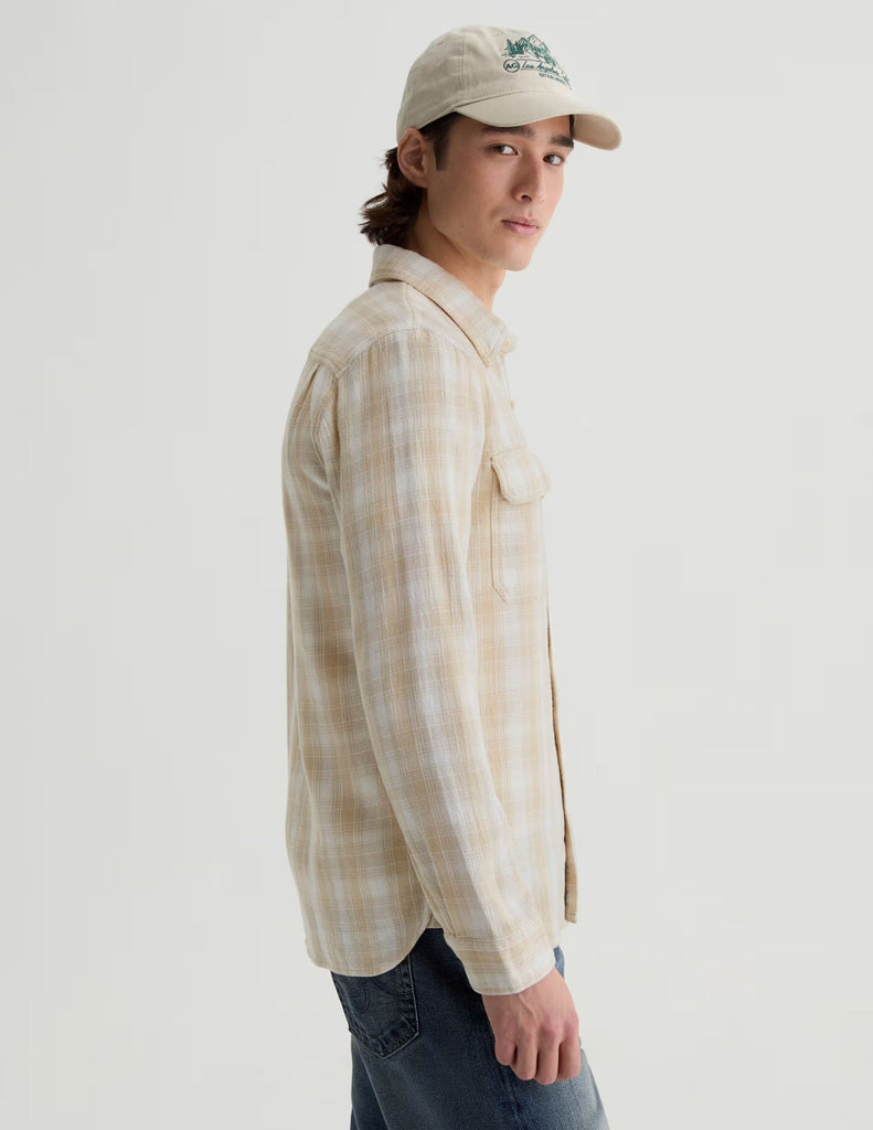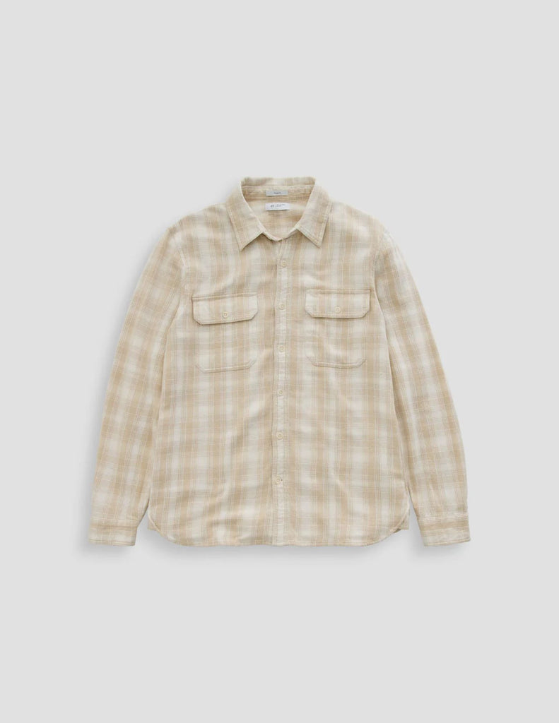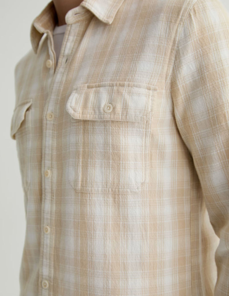 This utility button down shirt is crafted from Bay Cotton Plaid in light neutral colors. Classic fit, rounded hem, inspired by traditional workwear. Chest flap pockets and long sleeves detailed with tonal buttons.