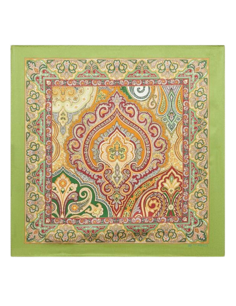 Pure silk pocket square iin shades of green. It is compete with an ETRO logo in the corner.