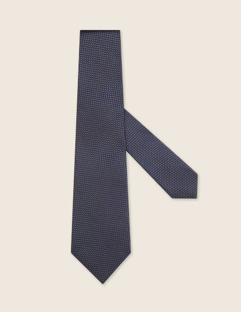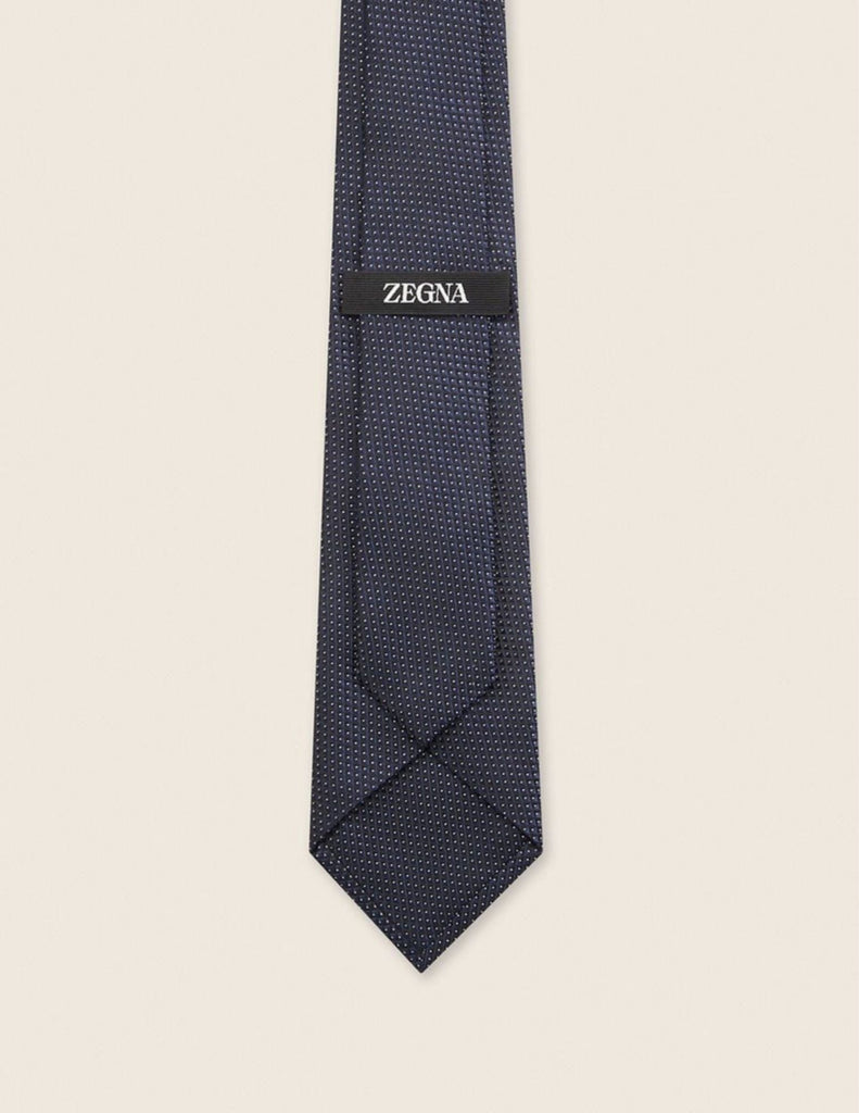 Add a dynamic touch to formal ensembles with this Notte Oasi tie, featuring a micro-geometric jacquard pattern. Crafted from pure silk for a lustrous sheen.  Notte Oasi (‘nɔt.te) – ITALIAN FOR 'NIGHT', this is the color of the clear alpine nights in the mountains of Oasi Zegna. The tone is identified as matte dark navy blue.
