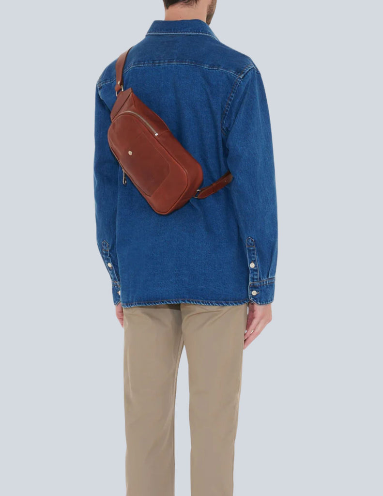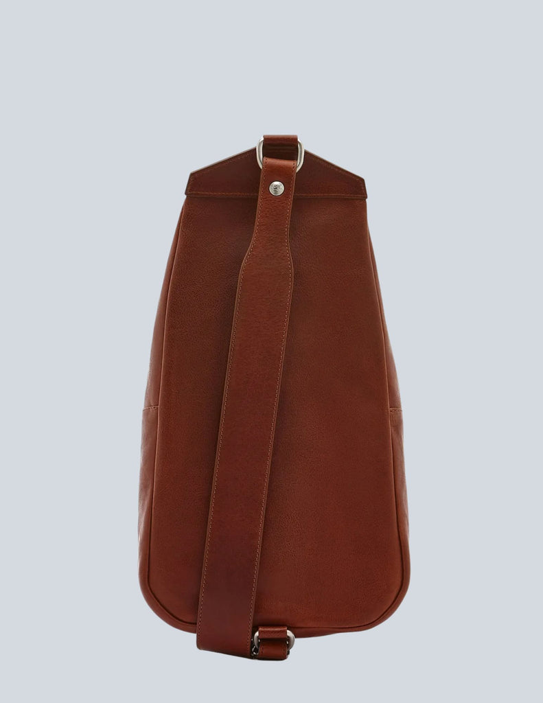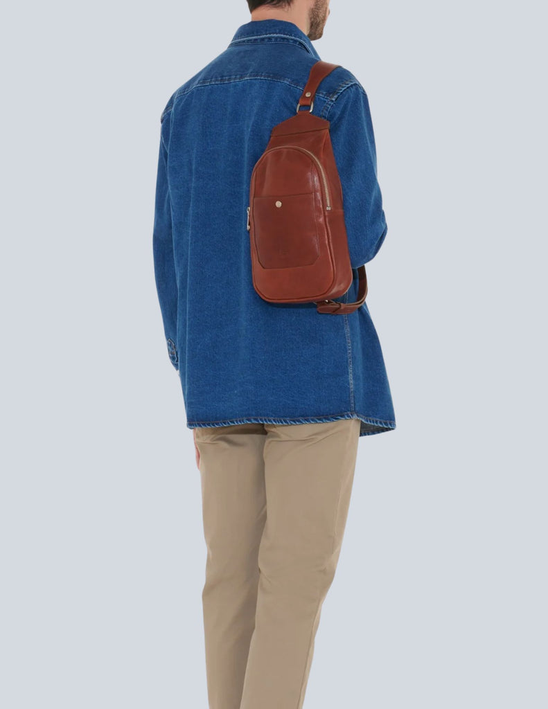 Men's single-shoulder backpack with an iconic geometric design. Adjustable shoulder strap. Deep front smartphone pocket with snap closure. Zip closure. The cotton canvas-lined interior features an open pocket with leather trim. 100% made in Italy, it is produced in the province of Florence by master artisons.