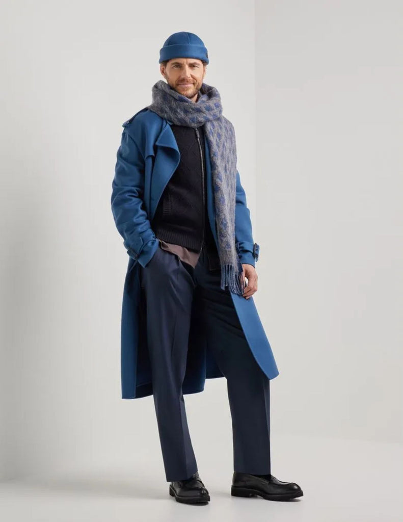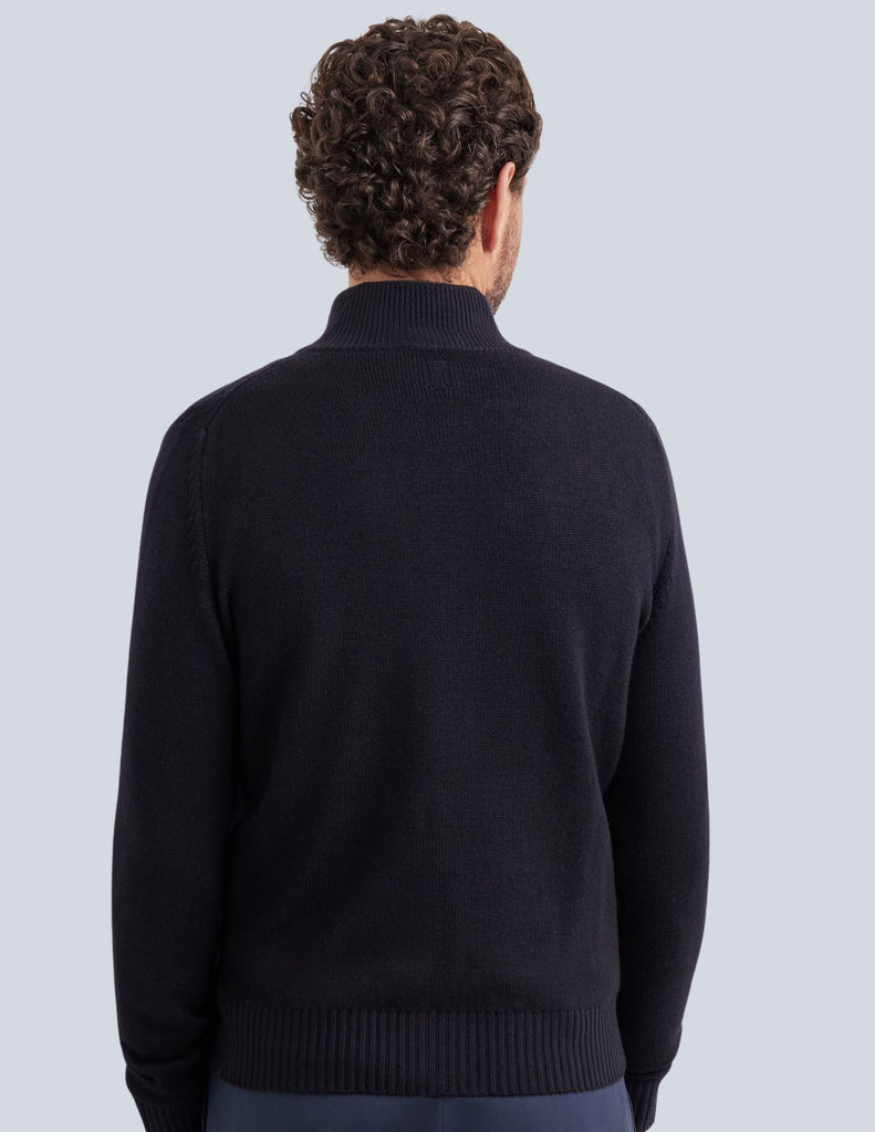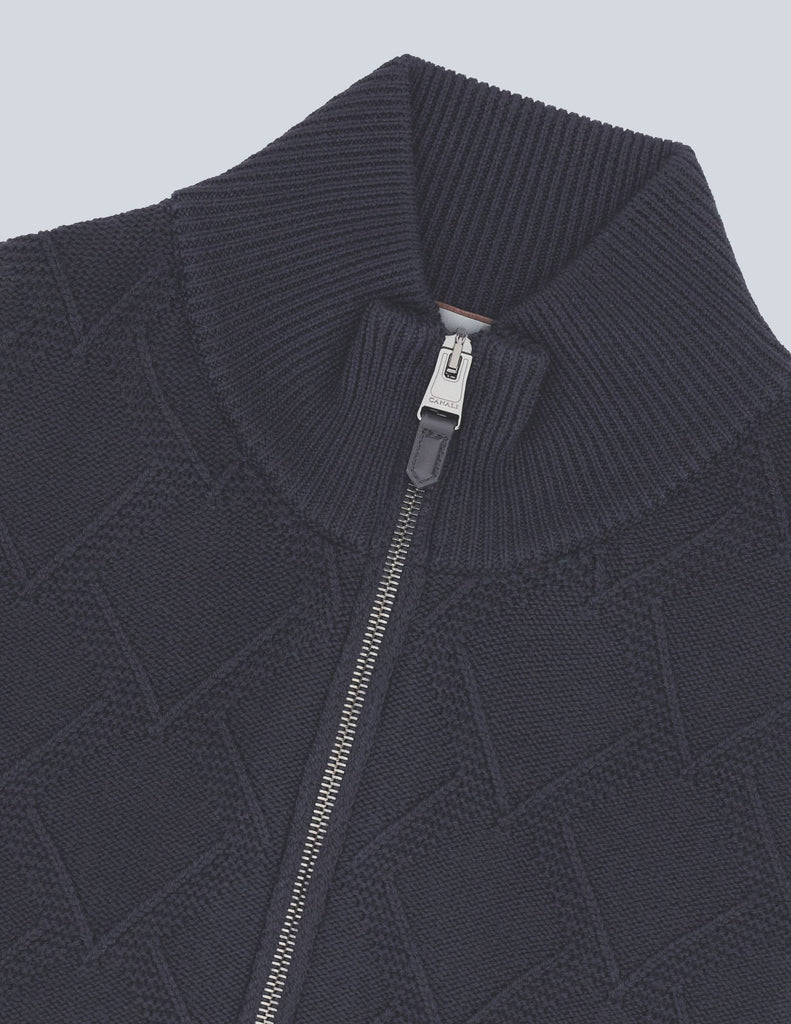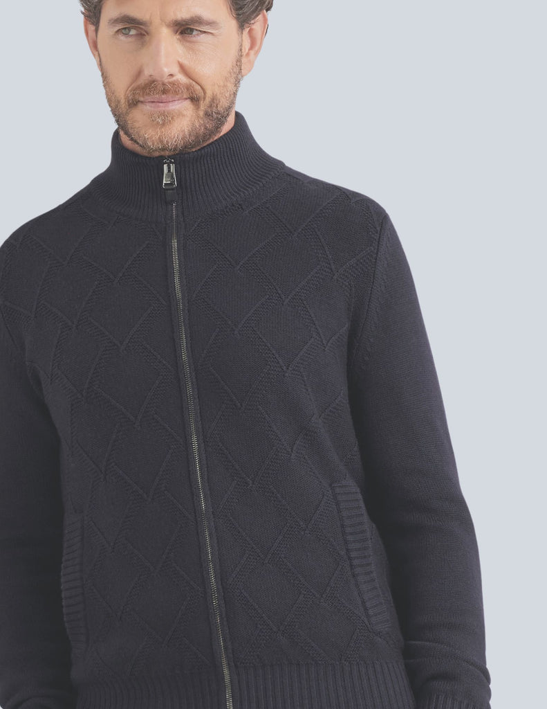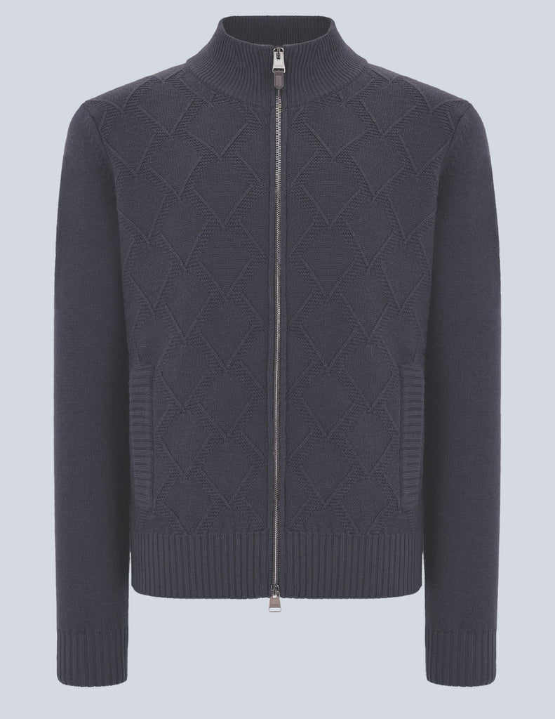 Double-slider full zipper cardigan in garment-dyed extra-fine merino wool, an emblem of dynamic elegance and contemporary understatement. The diamond macro-structure on the front harmonizes with the clean plain knit sleeves and back, creating a sophisticated balance between character and sophistication. A versatile and comfortable piece, perfect for interpreting every moment with natural elegance.