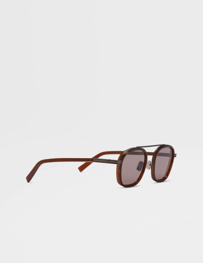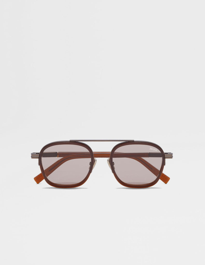 These Dark Foliage Orizzonte I sunglasses are characterized by a special construction with a high metal top bar, providing the inspiration behind their name. Defined by a stand-out combination of acetate and metal, these frames are equipped with adjustable nose pads for a secure fit, featuring the ZEGNA Logo. Enriched with chiseled lines on the temple tips and the shiny dark ruthenium ZEGNA 232 Road Brand Mark on the corners.
