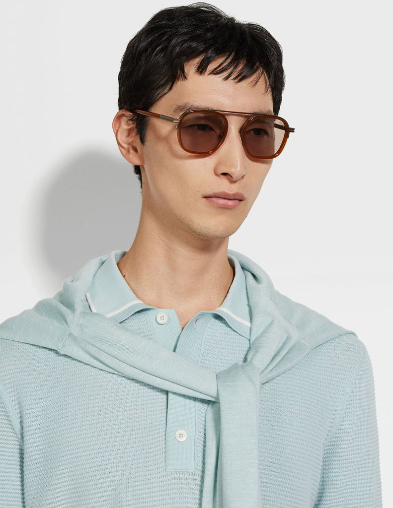 ORIZZONTE (oridˈdzonte) – ITALIAN FOR 'HORIZON' The inspiration for the Orizzonte I sunglasses was born in Oasi Zegna, the home of ZEGNA’s values in the Italian Alps. Its contemporary and casual bridgeless silhouette is embellished with the iconic 232 Road Brand Mark and the ZEGNA logo. The geometric shape is characterised by the special construction, featuring a high metal top bar that inspired the name ‘Orizzonte’.