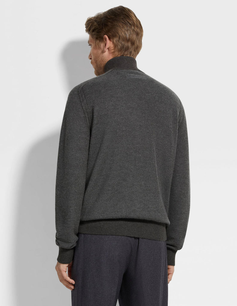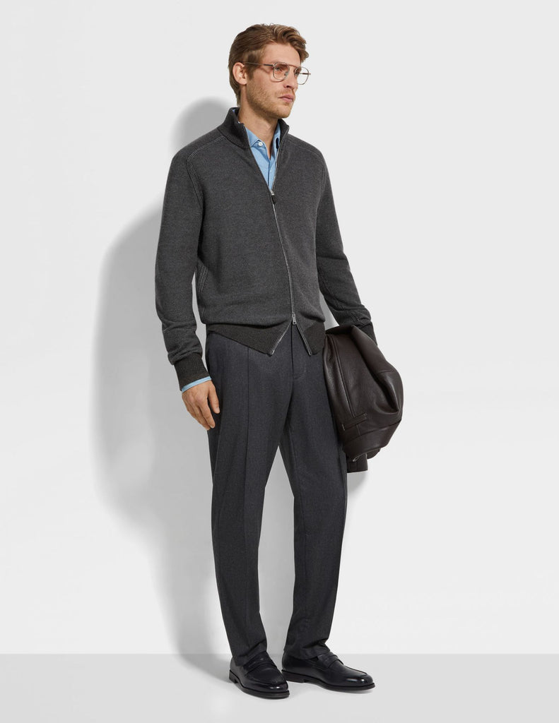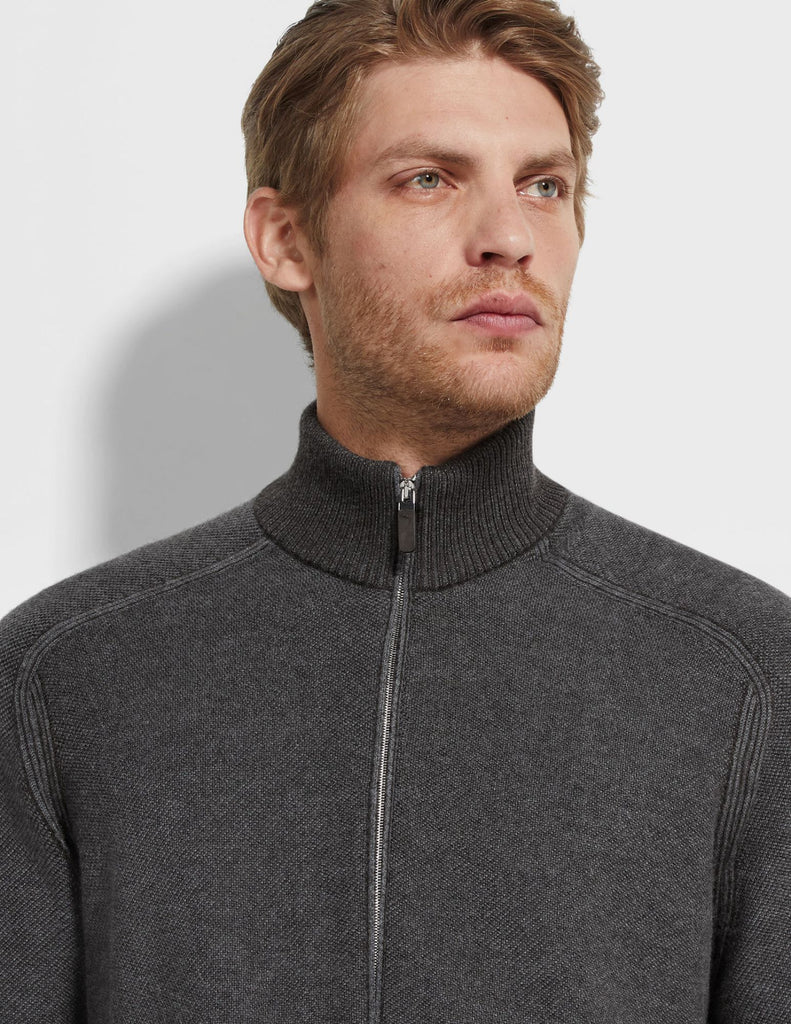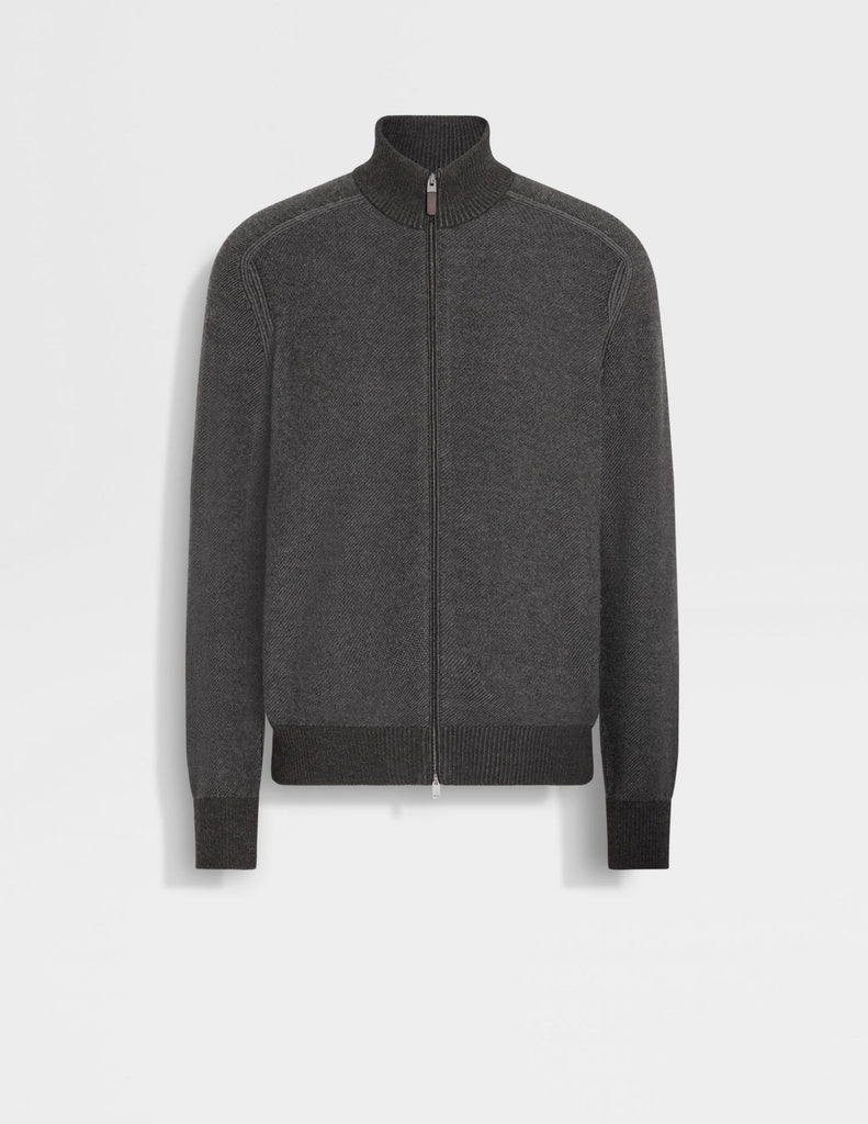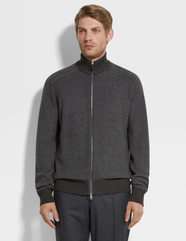 The very best of cashmere and silk. This zip-through cardigan is knit with a grey and dark brown bicolor jacquard design from ZEGNA's luxurious Cashseta: an exclusive fabric that's been yarn-dyed to create a distinctive mélange finish with subtle variations in each garment. Edged with snug ribbed trims.