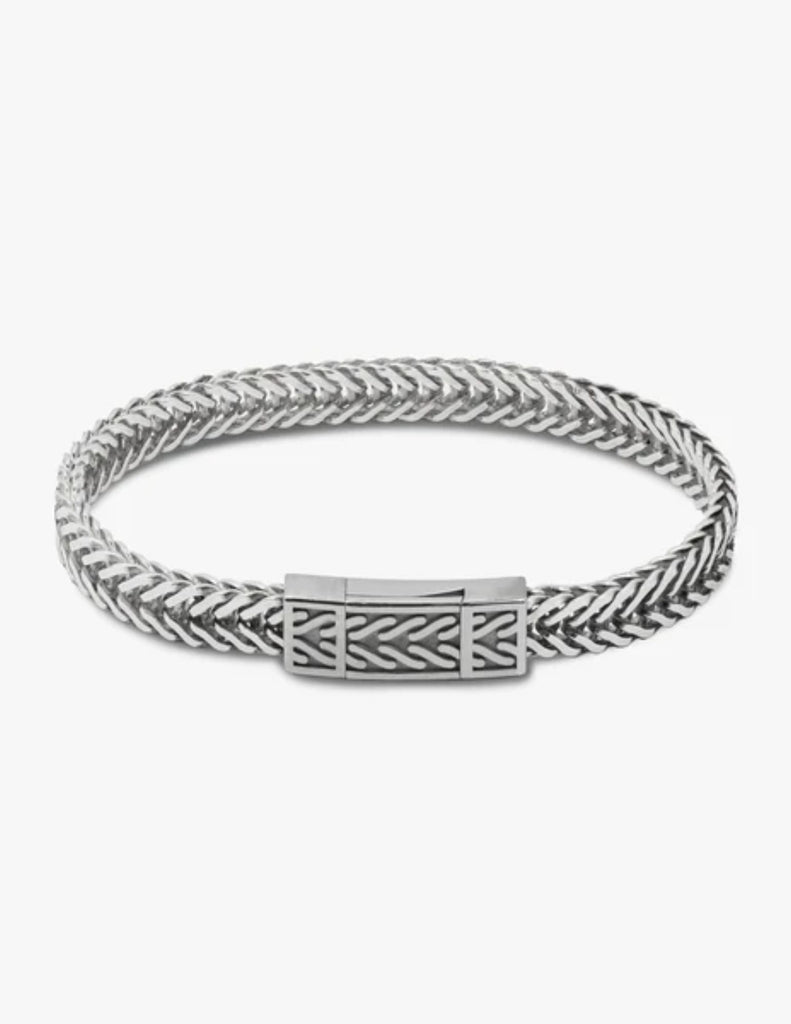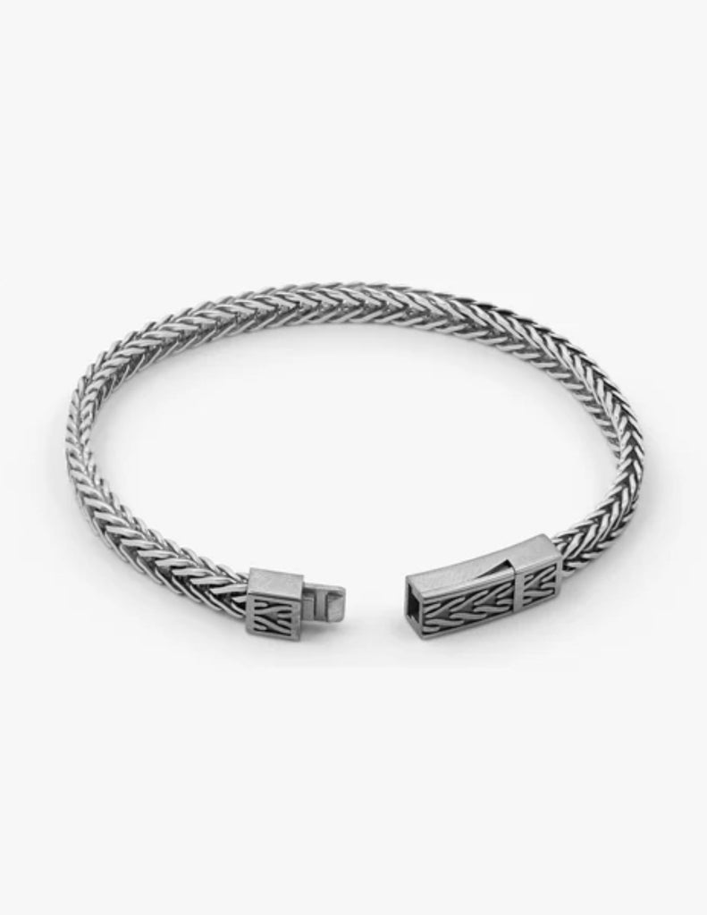 This bold chain bracelet features a single wrap chain formed using a herringbone pattern. Finished with a simple slide clasp in oxidised sterling silver and produced in our London workshop.