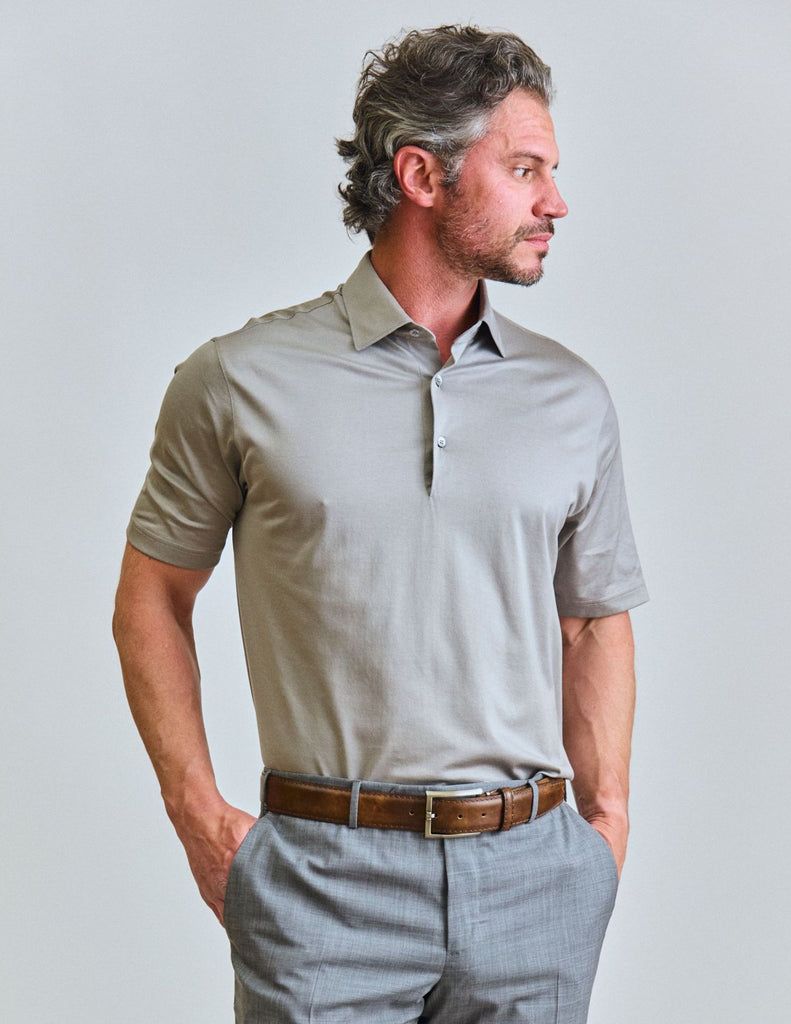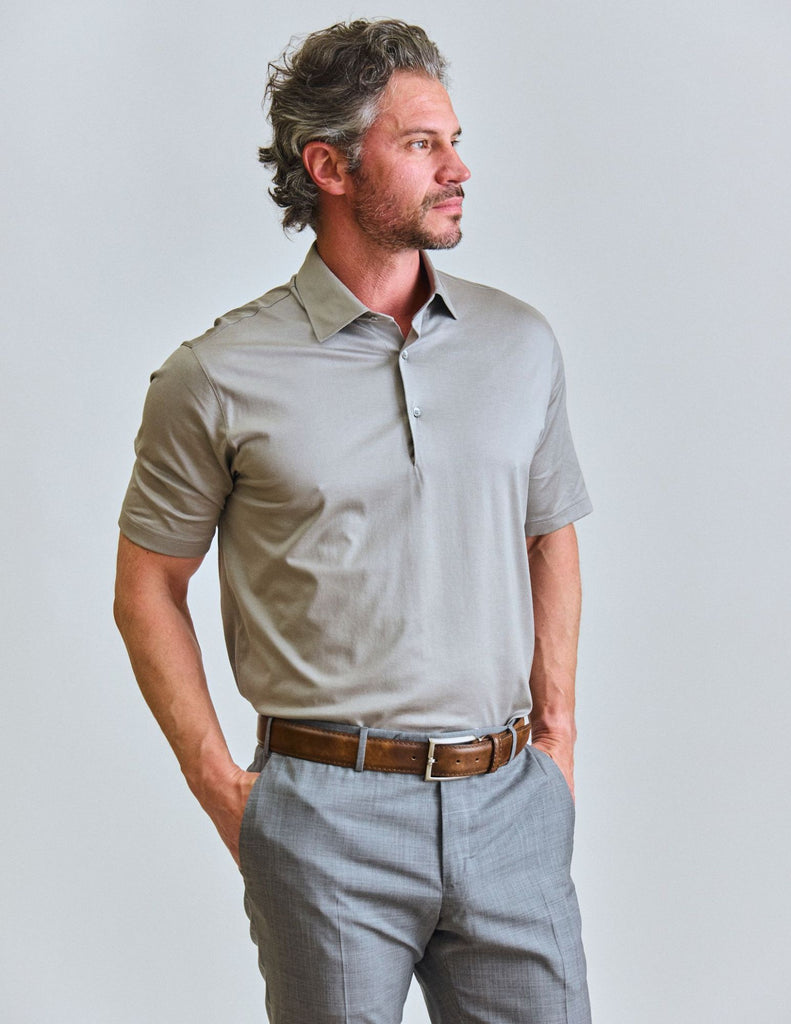 This luxe polo is on the more tailored style. It has a great strucktured; It looks great on its own and is the perfect polo to wear under a sportcoat.