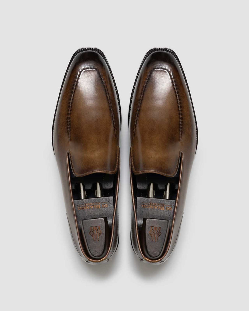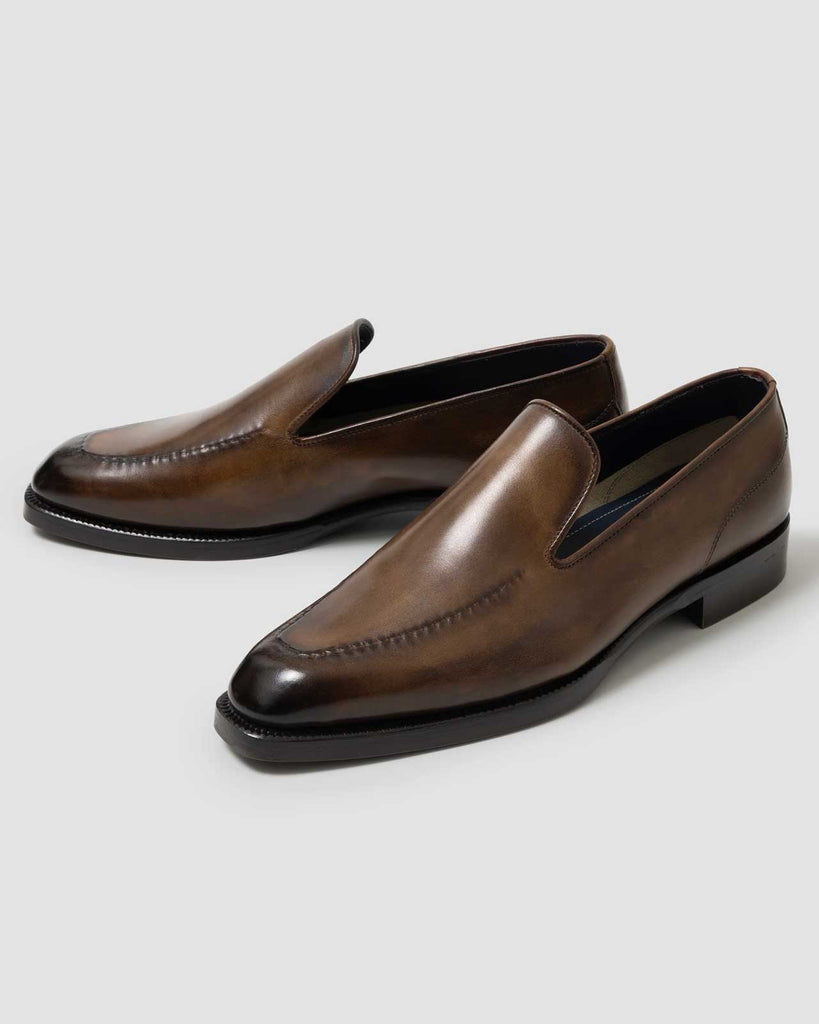 The Nogara Reverse Stitch Venetian loafer exemplifies minimalist sophistication. The reverse sombrero brown calfskin with distinctive hand-engineered stitching along the vamp creates subtle visual intrigue on its clean silhouette. Meticulously crafted on the San Carlo last with Blake Flex construction, this Premium Collection men's loafer delivers effortless comfort with refined distinction. Made in Italy.