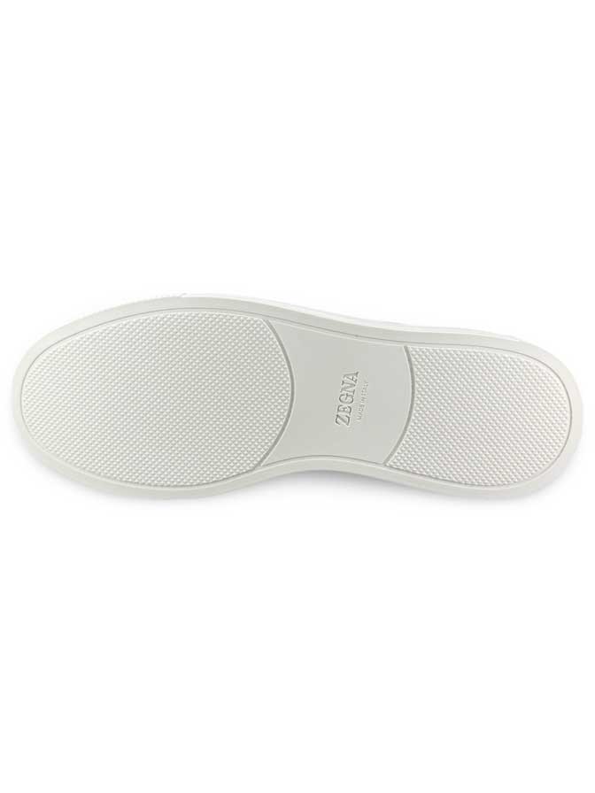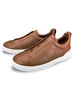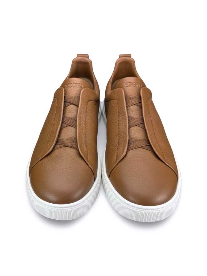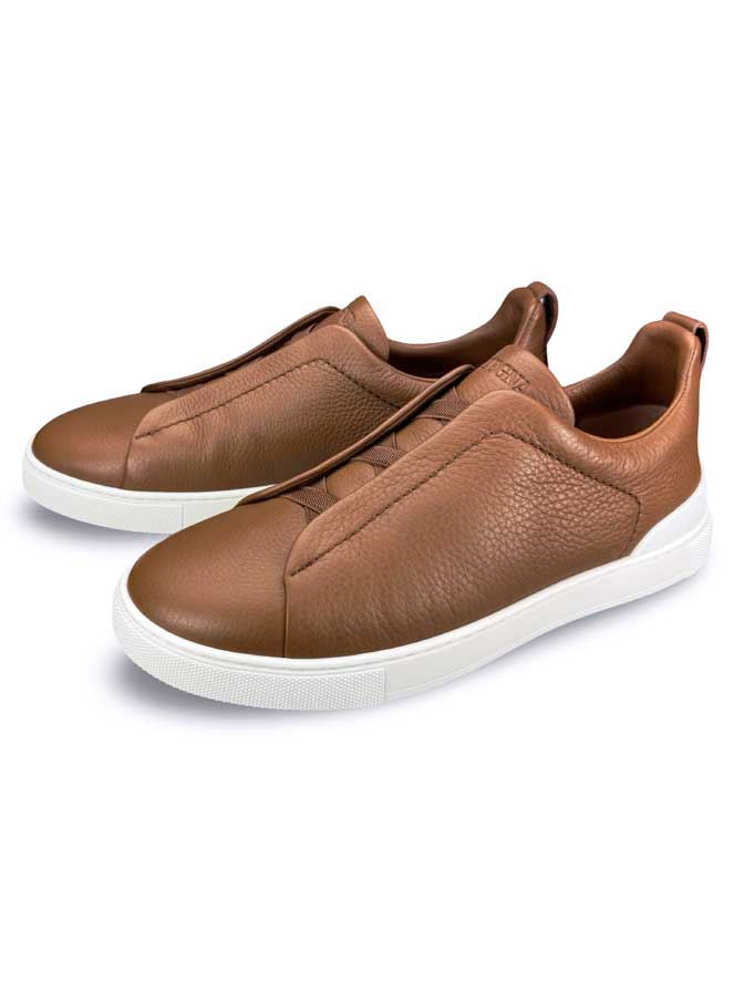 The tobacco deerskin Triple Stitch™ low-top sneakers are mounted on an extra-light, white rubber sole for a pop of contrast. The brand’s signature triple-crossed elastic detail ensures an easy slip-on fit, while evoking the traditional hand-stitching of tailored jackets to symbolize and honor Zegna’s legacy of fine craftsmanship. Foliage-colored leather lining completes the design.