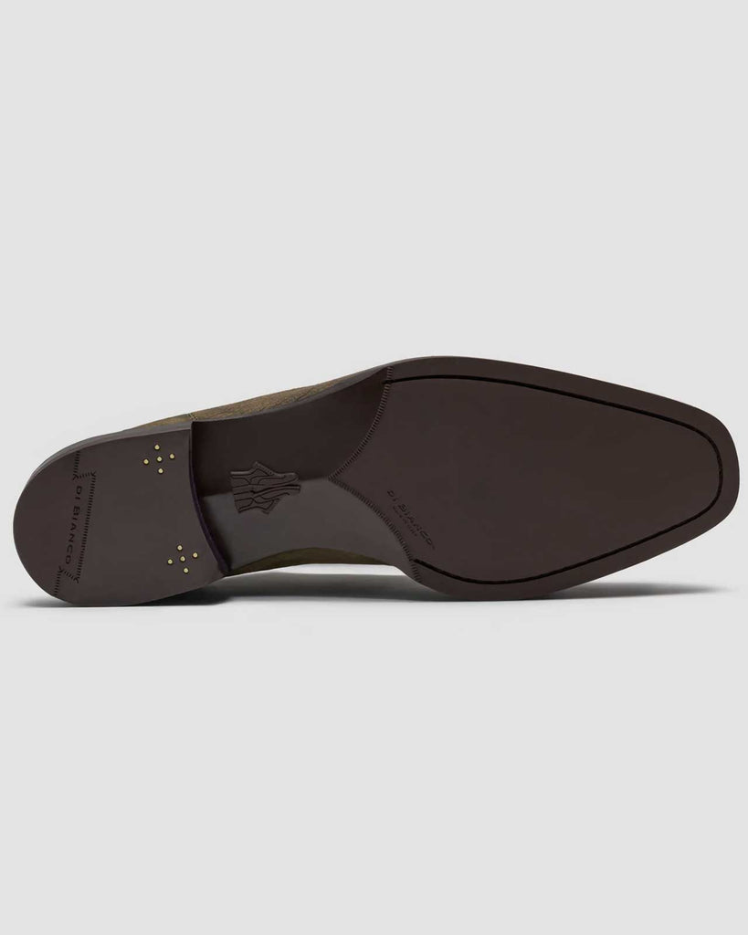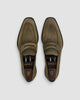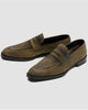 Vicenza commands attention through assertive modern design. This soft square penny loafer in corduroy nero oliva features angular keeper pitch, piping along collar and tongue, and distinctive slit penny hole creating a bold aesthetic. The nubuck-treated leather with powdery, velvety texture showcases olive base with gray-green clouding effects hand-burnished for lustrous depth. Built on the San Carlo last, this sophisticated statement piece delivers sexy Italian confidence without compromise. Made in Italy.