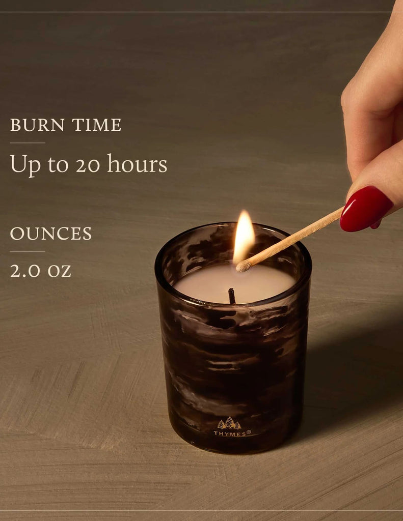 Small in size, big on atmosphere. Our Noir Woods Votive Candle is perfect for adding a touch of warmth wherever you need it. With a burn time of up to 20 hours, this 2 oz candle fills the room with a balanced blend of smoky wood, fresh evergreen, and golden amber. It comes in a black and grey vessel that captures the essence of smoke and soft, ambient light. Whether you're sampling the scent or gifting to someone special, this votive is a simple way to elevate any space.