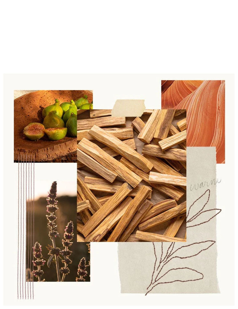Surround yourself with the comforting notes of warm palo santo wood, soft amber, and clary sage that effortlessly blend with the soothing aroma of creamy benzoin resin and green fig to inspire moments of self-care.
