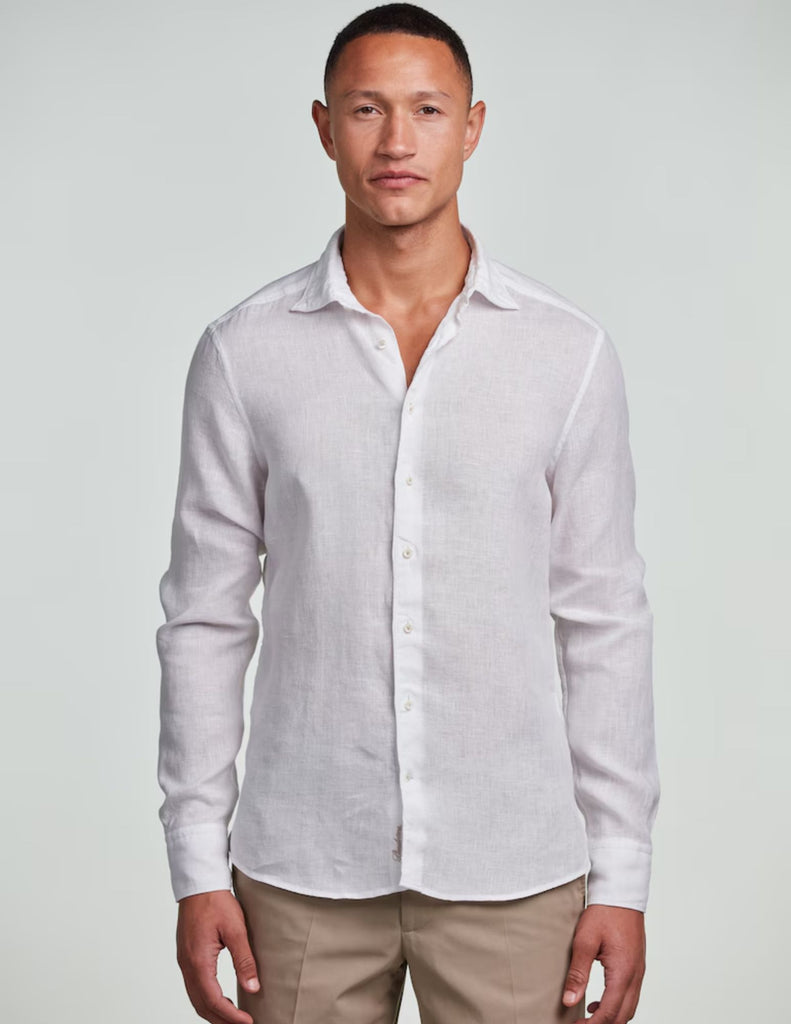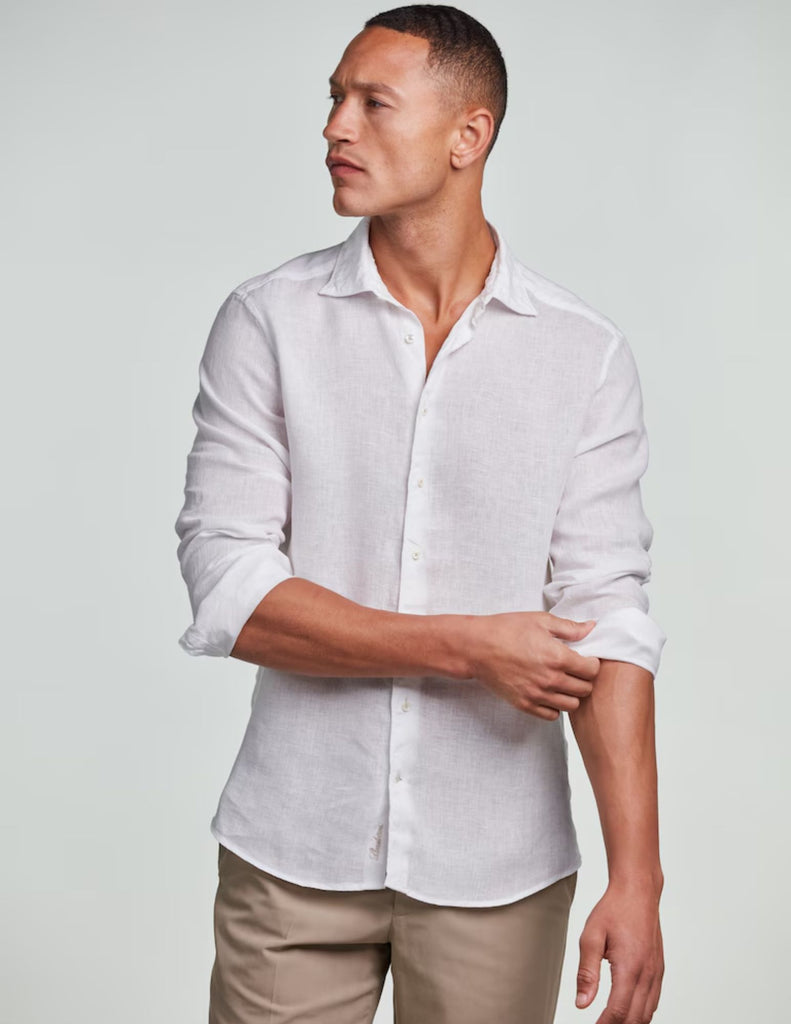 This shirt is made of linen and is detailed with mother of pearl buttons, single cuffs and a cut away collar.
