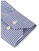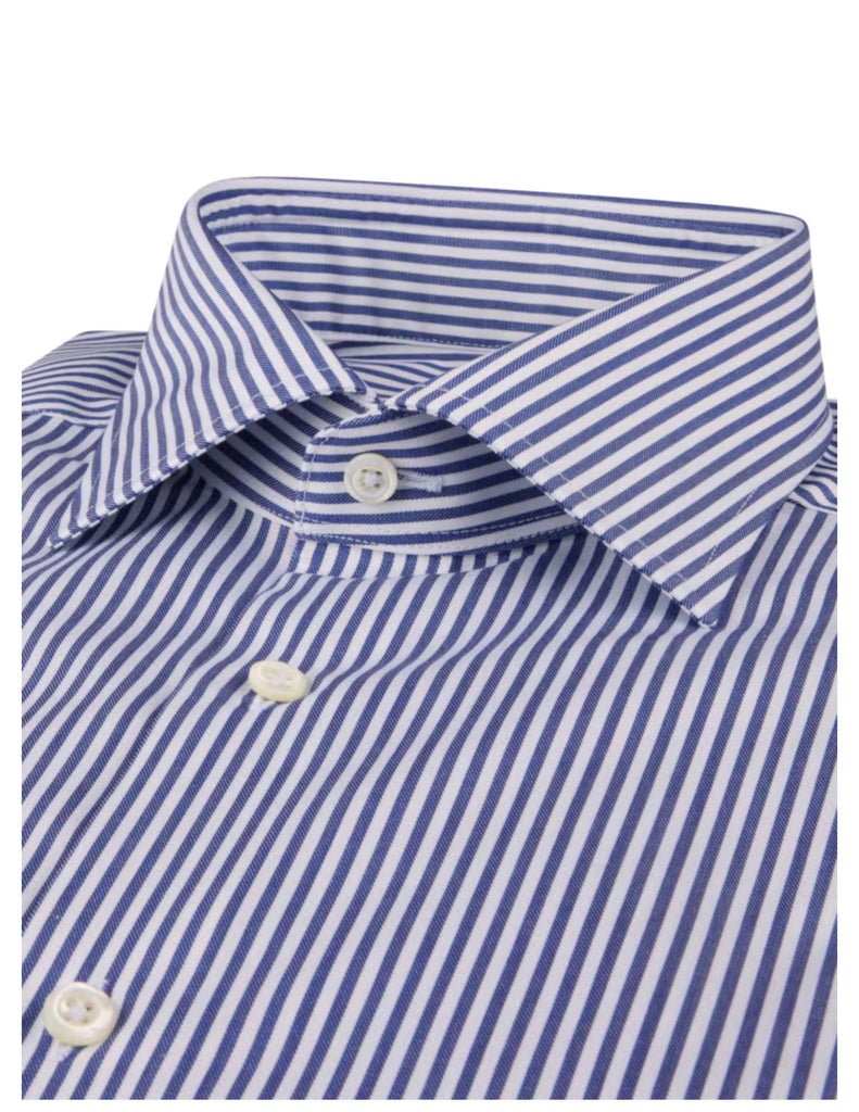 This striped twill shirt is made of twofold cotton. The shirt is detailed with mother of pearl buttons, single cuffs and a cut away collar.