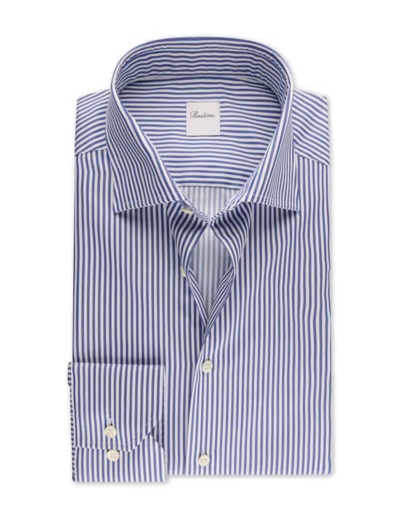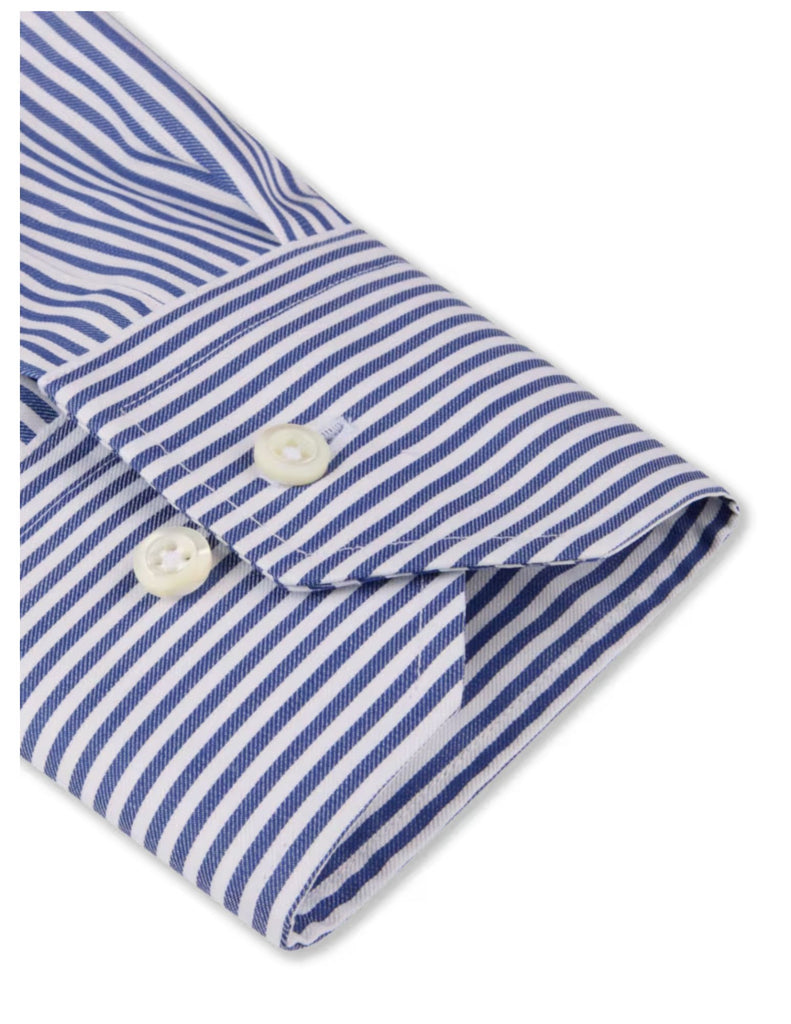 This striped twill shirt is made of twofold cotton. The shirt is detailed with mother of pearl buttons, single cuffs and a cut away collar.
