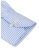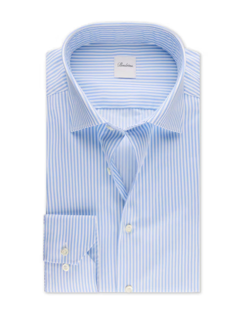 This striped twill shirt is made of twofold cotton. The shirt is detailed with mother of pearl buttons, single cuffs and a cut away collar.