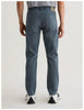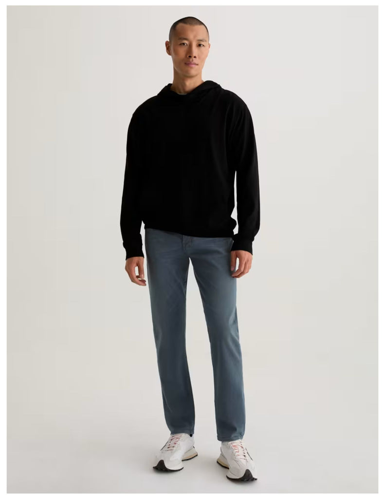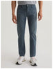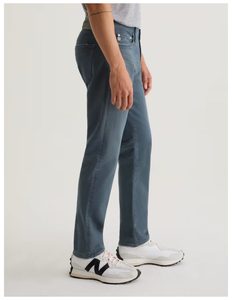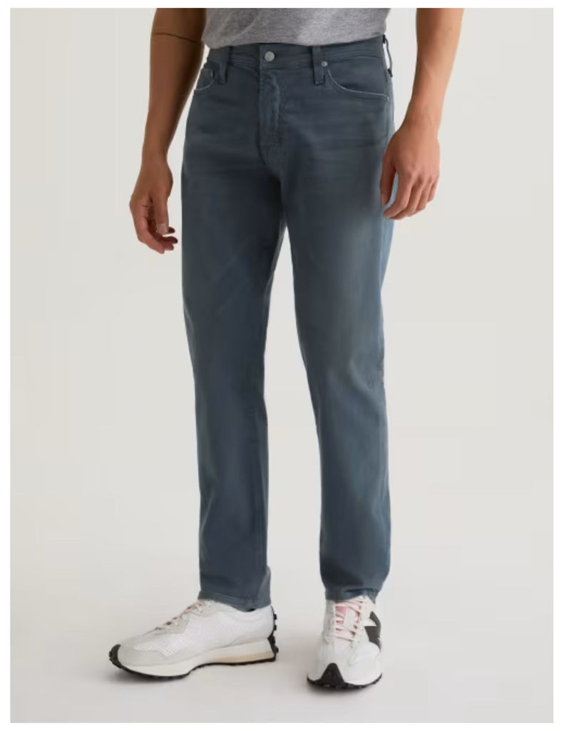 The Tellis modern slim jean combines classic denim styling with a contemporary silhouette. Designed with a fitted upper block and tapered leg opening that's slim but not too skinny. Crafted from their exclusive AG Cloud Soft Denim™, this five-pocket jean has a fitted upper block and a tapered leg opening in 8.7 oz. Hyper Soft Bull Denim, AG's exclusive left-hand twill fabric with a velvety texture. The fabric's special construction allows the yarns to gently relax and untwist for a supple feel that gets softer with every wear. It's blended with dual-elastic performance fibers, offering premium stretch and recovery. Shown here in sulfur-dyed dusty blue shade with a fade that emulates 7 years of AG-ed™ wear.
